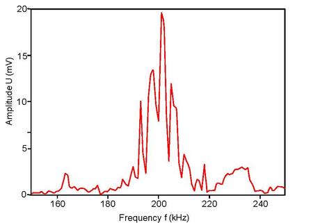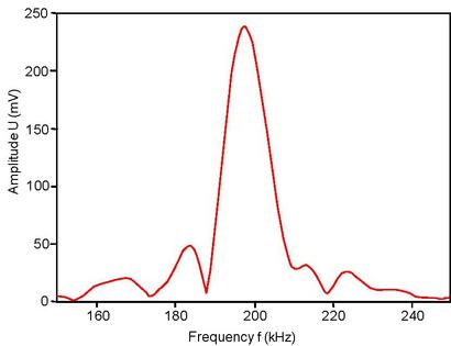 In order to ensure a sufficiently high sound intensity, low measurement frequencies of a few 100 kHz are used for excitation. The air ultrasonic transducers have a corresponding natural frequency close to the measurement frequency and are therefore driven in the resonance range. Figure 3 shows the frequency spectrum of the burst signal from Fig. 2. The resonance frequency at 200 kHz and the relatively narrow width of the frequency band can be recognised. This is intended in favour of maximum sound pressure and makes it possible to carry out defectoscopic examinations on panels and films using sensors with piston transducers.