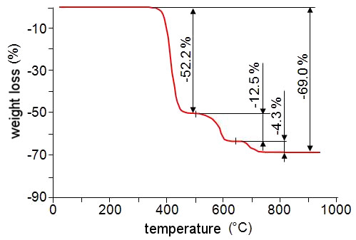 Fig.: Thermogravimetric curve of PTFE-filled PBT-GF 30, determination of the proportions of PTFE (12.5 %) and GF (31 %) [1].