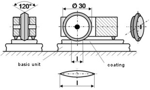 The indenter here is a small metal wheel (wheel-shaped cutting edge) with sharp edges in hardened tool steel, as shown in Fig. 1. The test load is 4.905 N for a duration of 30 s. The length l of the lens-shaped indentation is evaluated, whereby the dimensionless hardness value is calculated as 100 mm/l. The method is suitable for coating thicknesses in the range of 15 to 35 µm. The penetration depth must be between 5 and 24 µm.