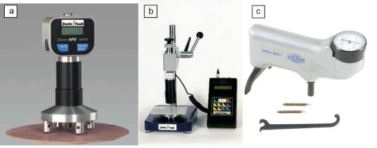 | Fig. 2: | Barcol hardness tester: (a) Hand tester Type 3350 from ZwickRoell GmbH & Co. KG, Ulm (b) stationary tester Zwick 3350 and (c) Barcol Tester Elcometer 3101 from Elcometer Instruments GmbH, Aalen |