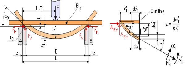 Since this differential equation and the associated boundary conditions depend on the inclination of the elastic line, this equation can only be solved numerically. For a solution that is manageable in engineering terms, it was therefore agreed to use the bending line on the undeformed specimen. Thus, the inclination of the bending line with ds/dx ≈ 0 becomes negligible and the simplified bending line according to Eq. (2) and Fig. 3 is obtained: