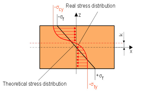 However, the solution of this differential equation with the bending stress σf and the peripheral fibre strain εf is only valid for small deflections (s << h), which is why interpretative problems often arise with ductile plastics in testing practice with deflections of up to 6 mm (s = 1.5 h, h = 4 mm). The application of these evaluation equations also presupposes a symmetrical stress and strain distribution over the cross-section, so that the zero line of the stress or strain is identical to the neutral fibre of the bending beam. As a result of the sometimes very different tensile and compressive behaviour of the plastics (for example polystyrene PS) with differing yield stresses σty and σcy, a shift k of the neutral fibre (Fig. 4) can therefore occur. As a result, the evaluation equations of the bending test are really no longer applicable.