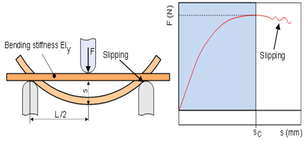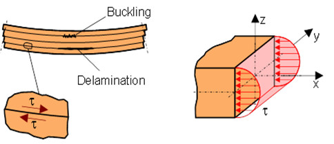 In addition to these normal stresses, parabolically distributed shear stresses occur across the cross-section, especially with thick specimens or very small support spans (Fig. 5). These shear stresses can cause delamination between the layers, especially in the case of laminae on the tensile side, and lead to incorrect material values. For this reason, the span-to-height ratio for isotropic and homogeneous plastics should be L = (16 ± 1) h, and for laminates a ratio of L = (20–25 ± 1) h should be maintained.