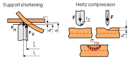 Assuming a crosshead travel measurement, the determined deflection and the resulting peripheral fibre strain are lower, which means that greater forces are required. As a result of the radius design, the measured signal may also include deflections wf, which are indirectly dependent on the Hertzian pressure and also cause a smaller deflection. An approximate consideration of the listed influencing factors on the calculated bending stress is shown below using the example of three-point bending.
