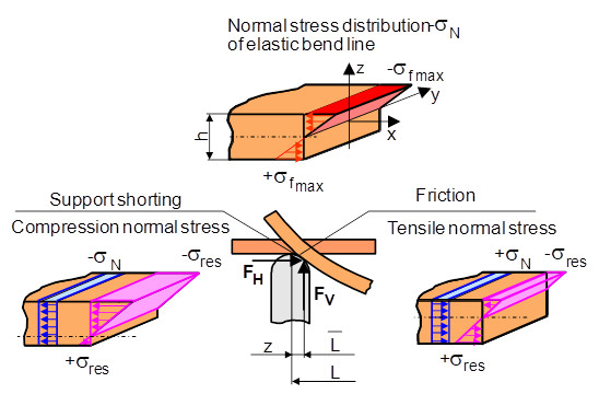 Figure 2 shows that the theoretically symmetrical stress distribution with respect to the test specimen cross-section is more strongly influenced by the normal stresses (tension and compression) with increasing radius of the support and larger deflections. Geometrically, this influencing variable can be expressed by the value z. The resulting stress σres can arise from the friction at the abutments or be caused by the shortening of the distance with the horizontal force FH. The frictional force naturally depends on the pairing of the materials of the support and the analysed material, and must be determined experimentally. In both cases, an asymmetrical stress pro-file is created, whereby these effects overlap and cause a displacement of the neutral fibre that cannot be precisely predicted. In addition to these influencing factors, the HERTZIAN pressure under the support and the loading die can cause a compressive stress which, however, drops very quickly towards the centre of the test specimen and is therefore not considered further (Fig. 3).
