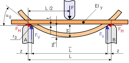 The elastic line for large deflections w is described with the general differential equation of the elastic bending line of the deformed bending test specimen (2nd order theory), which is complicated to handle from an engineering point of view and can only be solved numerically (Eq. 1), since the