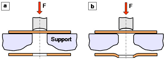 In the bend test on plastics, it is assumed in accordance with the preferred standards for the bending test of plastics [1, 2] that a pure normal stress state is present in the test specimen. In analogy to this, a pure shear stress condition should be present in the shear or punching test. In the presence of an exact adjustment and a sharp punching tool (Fig. 1a), a quality-compliant result is thus obtained. In the case of a blunt punching knife, rounding at the support span or a too large support distance, a deflection is additionally generated, which leads to a defective product (Fig. 1b).