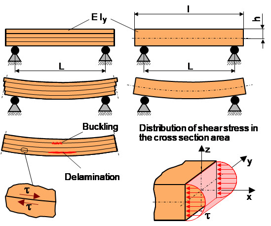 If one creates a lamination structure of the bending beam with four bonded individual layers, then one can see that in order to maintain the flat edge contour, forces act between the layers which manifest themselves in a shear stress. If the load due to the shear stress becomes too great, then, as is known, buckling effects occur on the upper pressure side or delamination between the individual layers on the lower tension side.