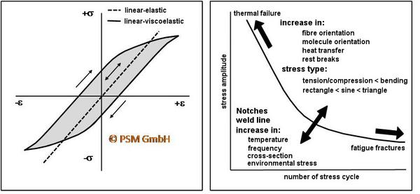 In plastics, the WÖHLER curve (S–N curve) shifts to lower load limits due to notches, weld true, increased frequencies, larger cross-sections and medial stresses. Increased load-bearing capacity can be expected with increasing molecular orientation, in composites with increased fibre orientation, with favourable heat dissipation and during load breaks (Fig. 2).