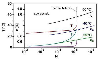 When εm and εa = const., the stress amplitude at the start of the test decreases with increasing number of load cycles. The same applies to the modulus of elasticity. At the same time, the level of the stress amplitude at the start of the test causes an increase in the test specimen temperature, which can lead to thermal failure.