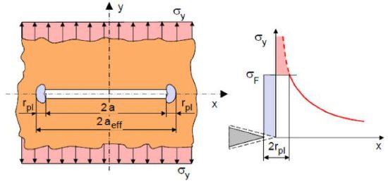 According to the model established by Irwin and Mc Clintock [1–3], it is assumed that the crack length required to calculate the fracture toughness is composed of the initial crack length a0 and the radius of the plastic zone apl as the effective value aeff (for experimental determination see effective crack length).