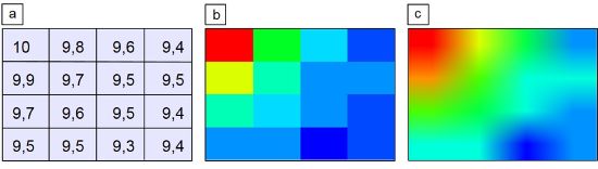 Fig. 3: Example of a matrix from the time values (ultrasound runtime) of the zero crossings of triggered amplitudes from the HF-scan (a), colour-coded matrix (b), and the smoothed presentation of the colour matrix (c)