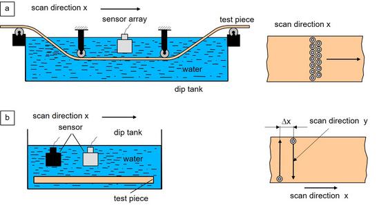 The D-scan is an ultrasound testing and evaluation method for two-dimensional imaging of the acoustic properties of the surfaces of test specimens. The D-scan, which is usually generated together with the C-scan, is composed of A-scans that have been recorded using a raster of equidistant measuring points. In contrast to the C-scan, a colour or gray value is assigned to the sound runtime of the first recorded amplitude of the received signal. The recording of the amplitudes depends on whether they exceed a trigger threshold defined by the tester. This means that each A-scan is assigned a colour or gray value depending on the start of the measurement interval and the trigger threshold. In the D-scan, these image points are combined, and the colour values are graded and displayed relative to the scale of the colour palette used [1, 2]. The tests required for the D-scan can be performed using air ultrasound, the squirter technique, or in an immersion bath. If a moving test object is present, e.g., a passing plate, then a fixed sensor array can be used; otherwise, the sensor (see: ultrasonic sensors) performs a meandering scanning movement on the stationary test object (Fig. 1) [3].