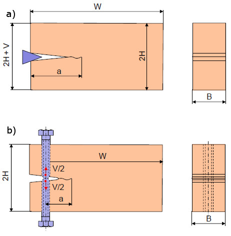 The principle procedure for carrying out the test is shown in Figure 4. The loading on the DCB-specimen can be applied either by a constant load (F = const.) or by a constant deformation (v = const.) using wedges or bolts. In the case of F = const., the KI value that triggers the start of stable crack propagation is determined over several differently loaded test specimens, whereby the corresponding values of F and a are to be used in the determination equation for KI. At v = const. the KI value decreases with increasing crack extension in the corrosive medium and causes the crack to stop. The KIscc value to be calculated belongs to this crack length a and the present notch displacement v according to the corresponding determination equation. Further detailed information on the dimensions of the test specimen and the test procedure can be found in [3]. In analogy to linear elastic fracture mechanics (LEFM), the requirements for the geometry of the test specimens must also be controlled when determining fracture mechanical values under the influence of media for the evaluation of stress corrosion cracking in the plane strain state.