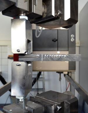 The test set-up shown in Fig. 7 was implemented at Polymer Service GmbH Merseburg to carry out fracture mechanics tests under Mode I loading on DCB-specimens. The left partial image shows the installation of a DCB-specimen in a universal testing machine Z 050 from ZwickRoell GmbH & Co. KG in the unloaded state. The right partial image shows a loaded condition with crack propagation.