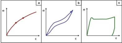 Another type of nonlinear behaviour is exhibited by rubber or elastomeric materials that are subjected to high strains and then relieved (Fig. 1b). If the unloading curve lies below the loading curve, energy is dissipated during the deformation cycle. This phenomenon is known as hysteresis. However, the term is only applicable if the material returns to zero deformation. If the elastomeric material is filled or reinforced, a permanent displacement occurs, as with other plastics, even if this is below the strain at yield stress, i.e., in the elastic or viscoelastic range.