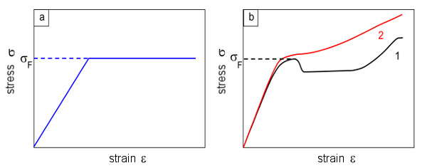 Plastic deformation is a combination of reversible and irreversible processes. In contrast to viscous (viscoelastic) behaviour, however, these do not occur simultaneously, but are separated by a yield point σF. Below this yield point, the material behaviour is elastic or viscoelastic; above it, irreversible flow processes take place (see Fig. 2a) [1].