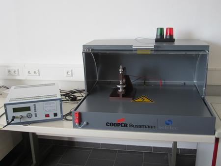 Fig. 1: High-voltage tester RMG 15 AC with electrode arrangement and test cage from Cooper Bussmann, Wuppertal