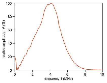 The corresponding Fourier transform is formed from a selected echo from the HF-scans determined at each raster point (Fig. 2). The value of the frequency at the amplitude maximum of the Fourier transform is thus determined for the respective echo at each raster point. A matrix with these frequencies is set up according to the raster. The frequency maximum and minimum are assigned to the extrema of the selected colour palette, resulting in a relative assignment of the colour values to the frequency values at the grid points (= the matrix elements), similar to the C-scan.