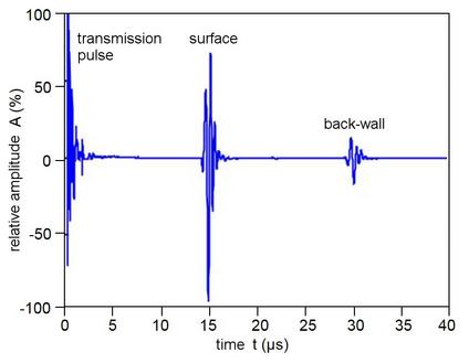 Figure 1 shows the result of a measurement on polypropylene (abbreviation: PP) with a thickness of 20 mm. While the surface echo reaches 100 % of the amplitude, the rear wall echo only reaches 17 %. This corresponds to a sound level loss of −15 dB and is typical for this plastic, which has a specific sound attenuation of 0.38 dB/mm.