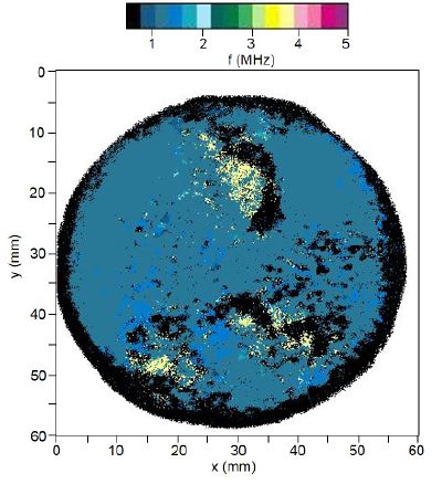 Figure 3 shows the F-scan of a test specimen made of polyamide 6 (abbreviation: PA 6), which reveals defects in the detected test specimen volume. In contrast, these defects could not be detected in a measurement with an amplitude-based C-scan due to the high sound attenuation. The F-scan allows, for example, air inclusions (see: gas bubbles and pores) in highly sound-attenuating materials to be detected more effectively using this frequency-based evaluation method, thereby extending the range of ultrasound testing and its resolution to weak but frequency-sensitive echo signals.
