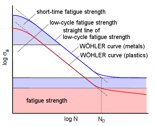 As expected, the S-N line shows an increase in the number of cycles N with decreasing stress amplitude. In metallic materials, especially structural steels, the WÖHLER line approaches a horizontal line above a certain number of cycles ND. This stress limit, at which no fracture occurs even after an infinite number of cycles, is the fatigue vibration strength, often referred to simply as fatigue strength σD. To determine this value in practice, the WÖHLER test must be carried out until a limit number of cycles NG is reached. Values for NG derived from experience are 2•106 for steels and 10 to 50•106 for light metals. For non-metallic materials and metallic materials under corrosive stress, the WÖHLER line (S–N line) continues to decline even at very high fatigue cycles. For plastics, a fatigue strength based on 7•107 fatigue cycles is determined. However, fatigue fractures are to be expected here even at higher fatigue cycles.