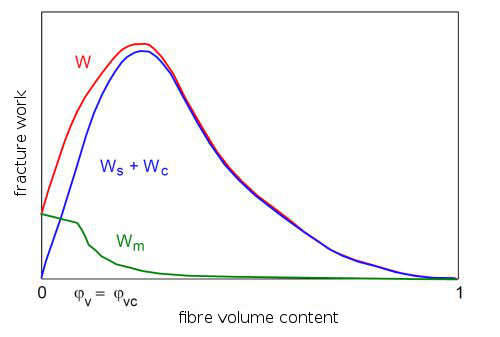 Every energy dissipation mechanism is subject to a certain dependence on the fibre content. These relationships are shown in Figure 2, which also includes the resulting sum curve WG. The energy Wm dissipated during crack growth due to plastic matrix deformation decreases with increasing fibre content φV because the proportion of the polymer matrix involved in the deformation process also decreases by a factor of (1–φV) [3]. The functional dependence of Wm on φV exhibits a discontinuity at φV = φVc. Up to this fibre content, macroscopic plastic flow occurs depending on the test specimen thickness and the stress conditions. The characteristic composite parameter φVc depends on the aspect ratio and is calculated from Eq. (3). Above φVc, the dissipated energy for plastic matrix deformation decreases exponentially.