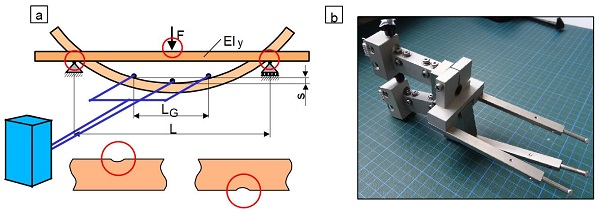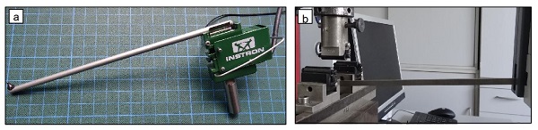 Fig. 3: Extensometer for mid-span deflection (a) Deflectometer W-E401-H from Fa. Instron Deutschland GmbH, Pfungstadt, and (b) bending sensor BTC-EXOMFL.H01 from Fa. ZwickRoell GmbH & Co. KG, Ulm