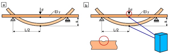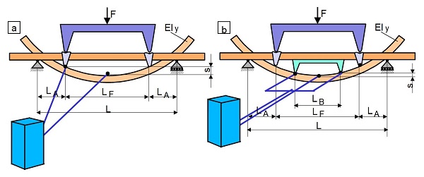 The relative distance s between the centre of the reference beam system or loosely mounted fork sensors and the centre of the test specimen within the bending beam gives the bending modulus according to Fig. 6b and Eq. (9). With this type of measuring system, influences on the deflection due to pressure on the supports and the test stamp can be avoided, although this requires a high-resolution measuring system.