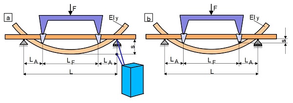 When determining the flexural modulus in the four-point bending test, there are various measurement variants that place different demands on the measurement technology. The simplest options here are also to use the traverse path (Fig. 5a) and to measure the centre deflection in analogy to the three-point bending test (Fig. 5b).