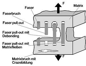 There are numerous attempts in the literature to describe the toughness behaviour of fibre-reinforced composites using models [2, 3]. An essential basic assumption in these models is often a brittle material behaviour (see: fracture types). Based on this, the toughness behaviour was modelled using theoretical concepts, whereby interaction parameters could often not be taken into account. In general, however, the failure process of short fibre-reinforced plastics is characterised by the occurrence of energy-dissipative processes, whereby the mechanisms shown in the figure occur: