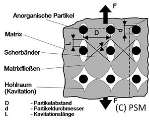 • Crazing (normal stress flow zone formation), i.e. the formation of cavities (see also: micromechanics & nanomechanics) This process causes a strong change in density and occurs in blends and practically all glassy polymers. Individual isolated crazes are often found at low stresses (Fig.).