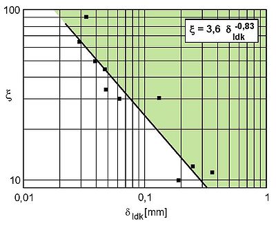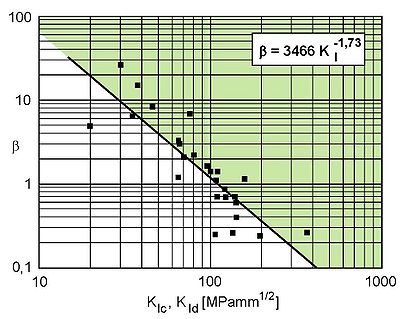 Experimental results regarding the influence of the test specimen thickness B on the fracture mechanical properties (see: fracture mechanical testing) for plastics are available in the literature. Figure 1 shows the dependence of the coefficient according to the above equation on the fracture toughness determined under quasi-static and impact loading (see: impact loading of plastics) for various plastics. The relationship shown was established on the basis of experimentally determined thickness and a/W dependencies and has a high degree of generalisation, as a common relationship results regardless of the type of stress (quasi-static, impact) and the material failure (stable, unstable) (see: Crack propagation).