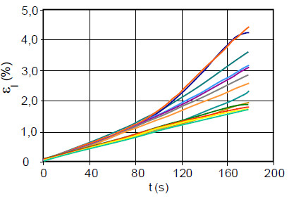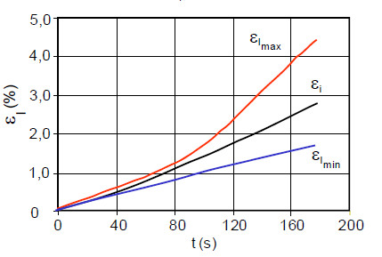 If the maximum and minimum strain is determined from Fig. 2 in relation to time or strain, independent of the location of occurrence, and the integral strain is also calculated (Fig. 3), then the heterogeneity is the difference between the maximum and minimum strain in relation to the integral strain in the test specimen volume. The following equation is used to determine the heterogeneity H: