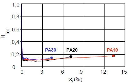 If the base materials PA 6-GF10, PA 6-GF20 and PA 6-GF30 are also analysed using laser extensometry, the heterogeneity functions are obtained as a function of the integral strain as shown in Fig. 6. The fracture heterogeneity is below 0.2 for all PA 6 modifications and the critical increases occur comparatively late in the non-linear viscoelastic range (see: elasticity), which is also determined using the hybrid methods of plastics diagnostics.