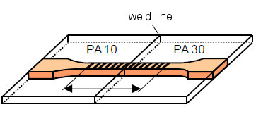 The primary field of application for the material parameter heterogeneity is structurally or morphologically heterogeneous materials in which changes in the deformation or damage mechanism are indicated by the heterogeneity function, provided there is sufficient sensitivity. If different PA 6 materials with different glass fibre contents (see also: ashing method) are welded together, as is common in the automotive industry, and test specimens are prepared from the plates (Fig. 5), these can be characterised using laser extensometry in the tensile test.