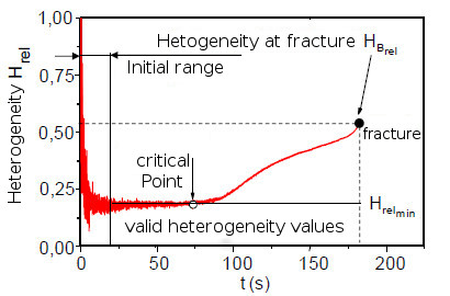 In the range of valid heterogeneity values, there is often a critical point at which the heterogeneity increases again after the minimum. This point corresponds to the accumulation of damage and hybrid methods of plastic diagnostics. When the fracture occurs, the fracture heterogeneity HBrel can then be specified as a characteristic value, which allows a simple comparison of different material states.