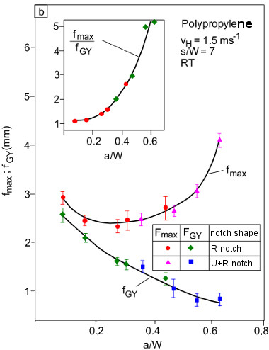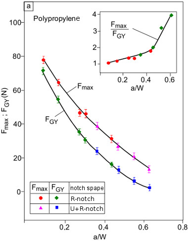 | Fig. 3: | Dependence of the loads Fmax, FGY (a) and the corresponding deflections fmax, fGY (b) for polypropylene (abbreviation: PP) on the a/W ratio |