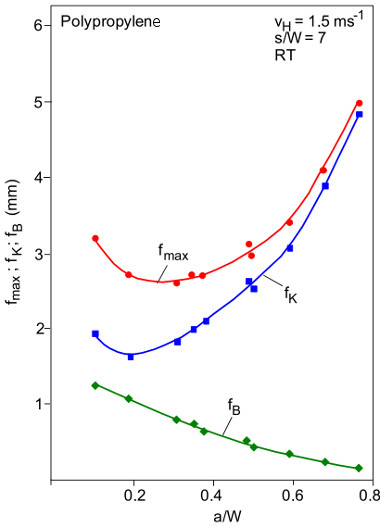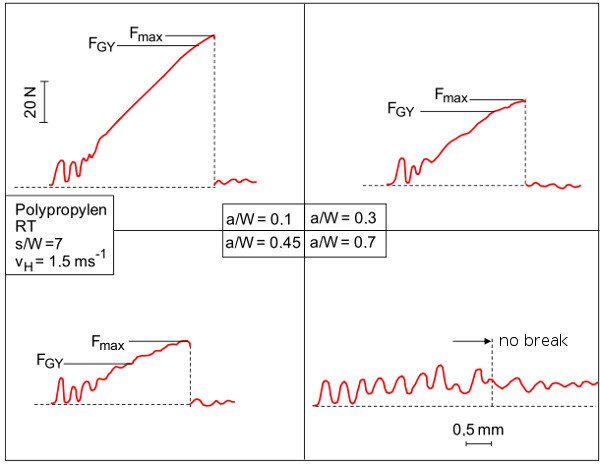 The problem of determining the measured variables from the F–f diagram will be explained using the example of investigations into the dependence on the a/W ratio for a polypropylene (abbreviation: PP) material at room temperature.