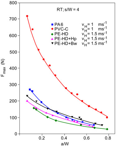 | Fig. 2: | Dependence of the maximum impact load Fmax on the a/W ratio for selected plastics |