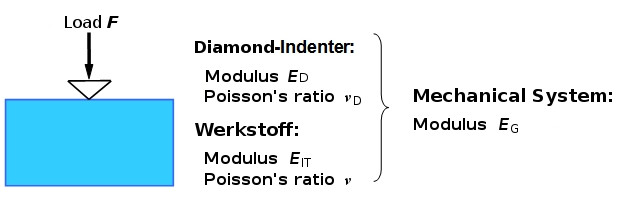 The indentation modulus EIT (in MPa) is determined in the micro load range of the hardness test using a method described in detail in ISO 14577 [1] from the initial rise of the unloading curve of the load (F)–indentation depth (h) diagram (see: instrumented hardness testing – method & material parameters) at the maximum load Fmax (dF/dh|Fmax). In the nanolast range of hardness testing, the method according to Oliver and Pharr is usually used [2]. According to ISO 14577, it is taken into account that the mechanical resistances of the test specimen and diamond indenter are connected in parallel (see Figure and Eq. 1)
