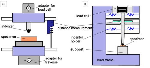 The basic structure of an instrumented hardness testing device is shown schematically in Figure 2, where additional devices for universal testing machines (Fig. 2a) or so-called stand-alone measuring systems (Fig. 2b) are used.