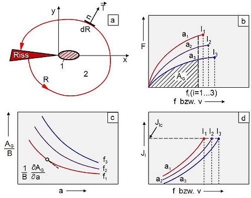 | Fig. 1: | Determination of the J-integral: path-independent contour integral with 1 – plastically deformed area (energy-dissipative zone) and 2 – elastically deformed area (a), experimentally determined load vs. load-line displacement curves of different crack lengths (b), energy determined by planimetrating the dependency F = F(v, f) dependence, related to the specimen thickness as a function of the crack length (c) and J-integral (d) determined by differentiating the curves (c) [3]. |