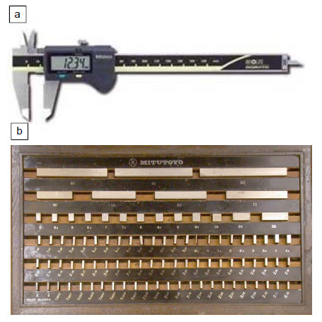 Fig. 1: Digital caliper 500-161-20 a) and set of gauge blocks b) from Mitutoyo