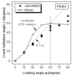 The crack initiation angles  calculated according to the modified MTS criterion tend to agree with the experimentally determined values, with  increasing up to  = 60° and changing less for  > 60° (Fig. 4).