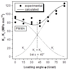 and compare it with the experimental data Kc of the stress intensity factor according to equation (1), as shown in Fig. 3. The good agreement between the experimentally determined Kc values and the KV values according to equation (5) can be explained by the assumption of a normal stress fracture hypothesis. The initial crack propagation angle β and the loading angle φ are identical up to about φ = 60°, i.e. the crack propagates perpendicular to the external stress according to this hypothesis (Fig. 4).