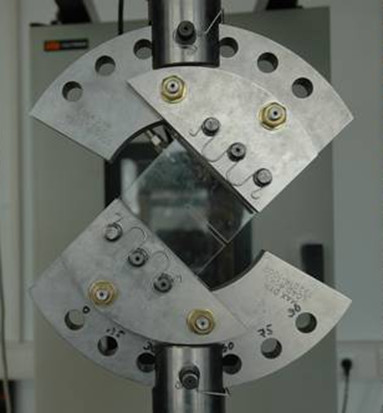 The device in Fig. 1 with a CTS (Compact Tension Shear) test specimen made of poly(methyl methacrylate) ( abbreviation: PMMA) subjected to external tension enables the realization of pure modes I and II as well as mixed-mode I/II conditions by varying the angle φ between the notch and the direction of loading in the range from 0° to 90°.