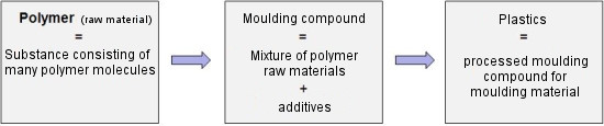 | Fig.: | Distinction between terms: polymer (substance), moulding compound (mixture of substances), plastic (moulding compound/material) [1] |