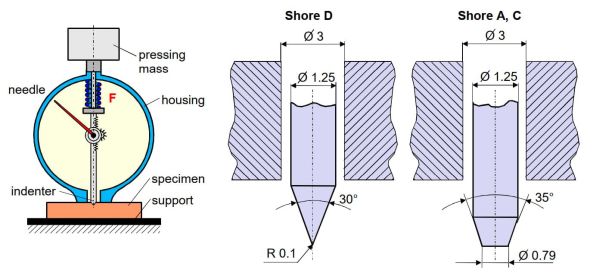 The SHORE hardness, named after Albert Ferdinand Shore, is a characteristic value that is mainly used for elastomers and rubber-elastic polymers. It is directly related to the indentation depth and is thus a measure of the material hardness. According to DIN 53505 [1], which was valid until 2012, a distinction is made between the SHORE A, C and D methods. A spring-loaded pin made of hardened steel is used as the indenter. In these methods, the respective indenter is pressed into the test specimen with a spring force and the indentation depth thus represents a measure of the SHORE hardness. The analogue hardness tester and the indenters used are shown in the following schematic Figure 1.