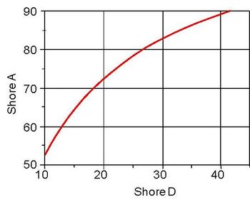 | Figure 4: | Theoretical relationship between SHORE A and SHORE D hardness according to K. Tobisch [3] |